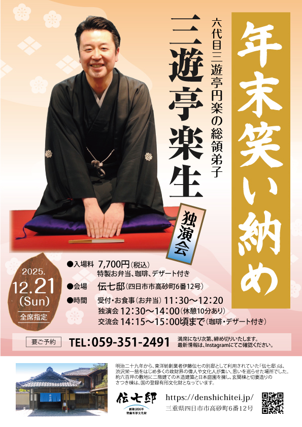 残席わずか!2025年12月21日開催『三遊亭楽生』独演会~年末笑い納め~のお知らせ