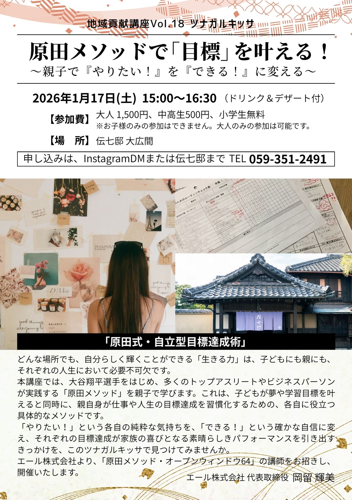2026年1月17日開催 原田メソッドで「目標」を叶える! ツナガルキッサのお知らせ